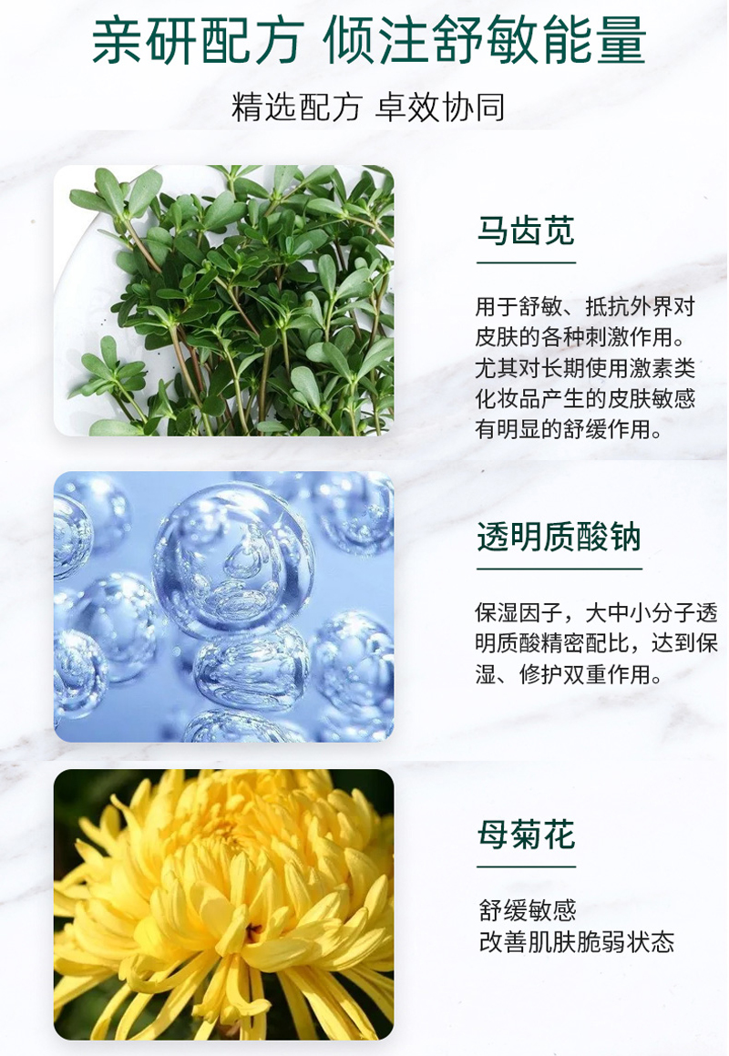 产品功效:浓缩多种天然植物的舒缓及修护成分,温和无刺激,缓解肌肤各种红敏脆弱现象,改善肌肤不适感。