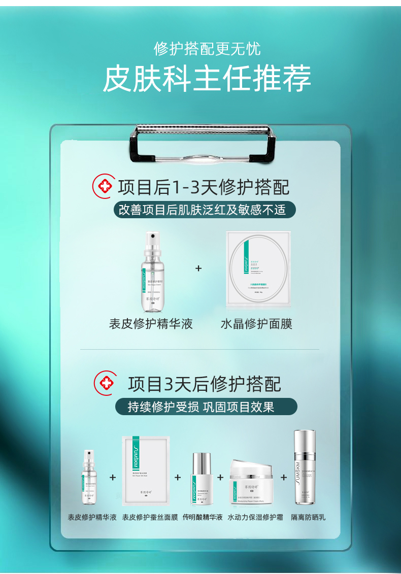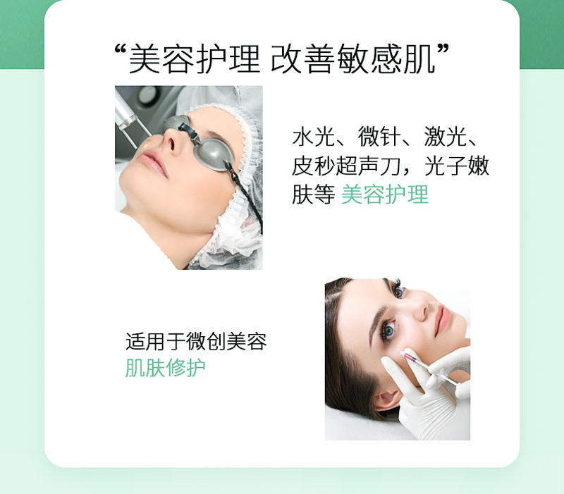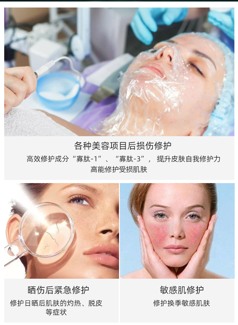 多种脆弱肌肤修护,以及正常肌肤的保养。特别适用于各种微创术后(如激光、脉冲光、果酸护理、皮肤磨削、点痣、三纹术等)修护,以及正常肌肤的保养
