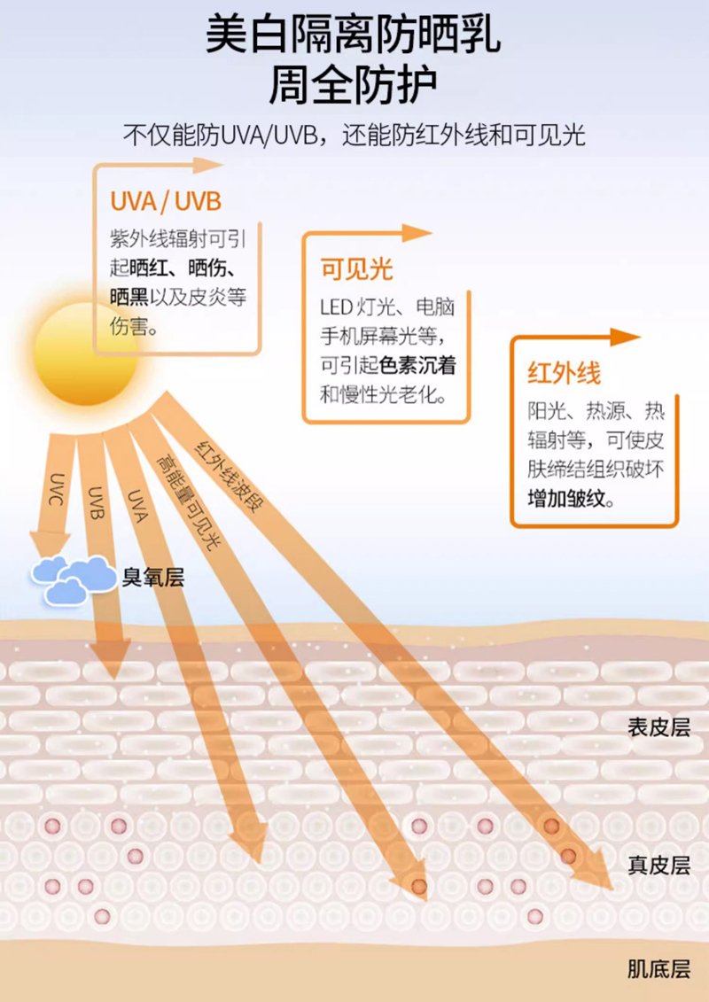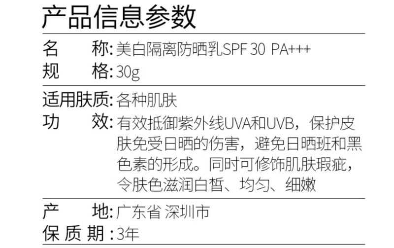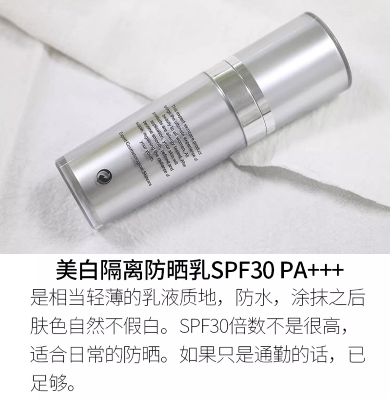 ① 防晒隔离:它的防晒系数为SPF30+/PA+++,可以有阻隔UVA、UVB及环境中之各种有害光线和粉尘,让肌肤不会晒伤晒黑,让肌肤一整天不受侵害。
