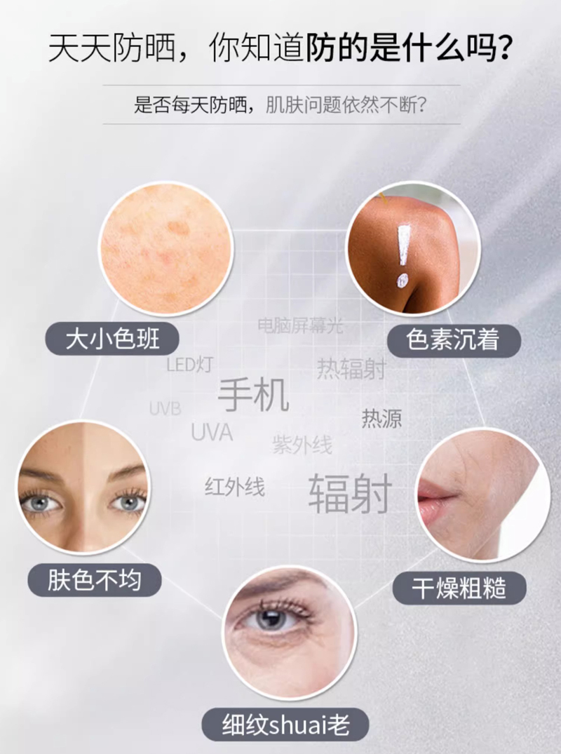 产品功效:有抵御紫外线UVA和UVB,保护皮肤免受日晒的伤害,避免日晒斑和黑色素的形成。同时可修饰肌肤瑕疵,令肤色自然白皙、均匀、细嫩。