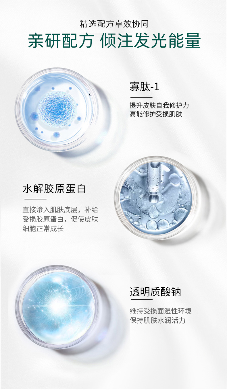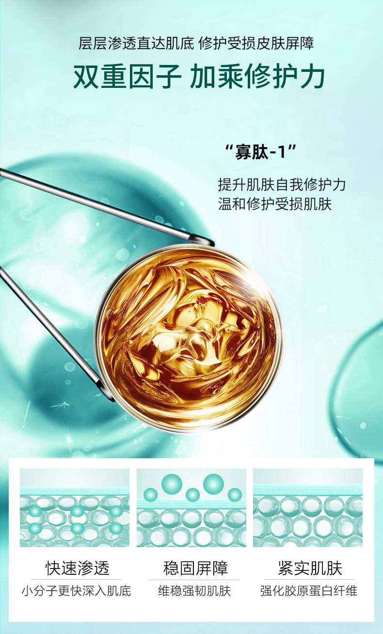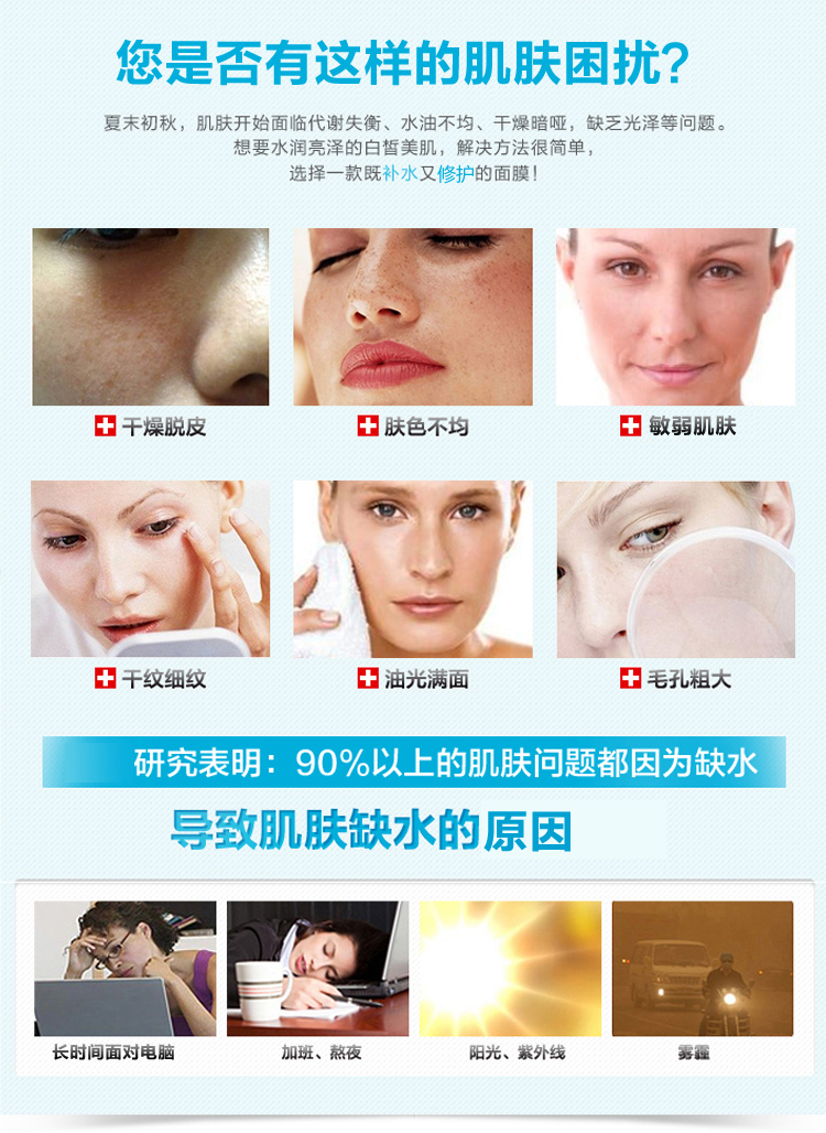 补水保湿,修护肌肤,令肌肤富于弹性、晶莹细嫩