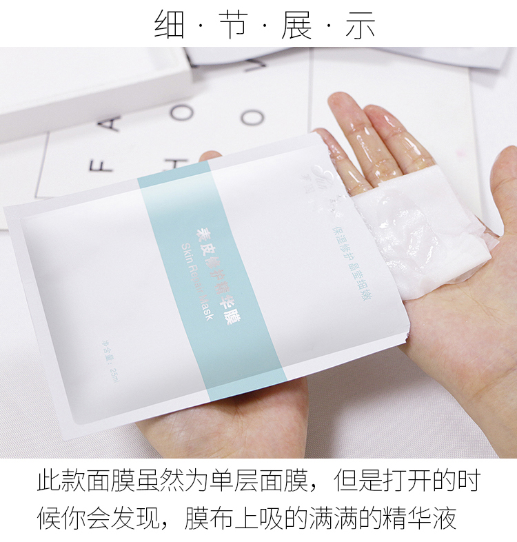 使用方法:洁肤后,撕开包装取出膜体,静敷30分钟后揭去,配合按摩至吸收。冷藏后使用更佳。
