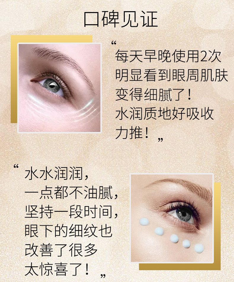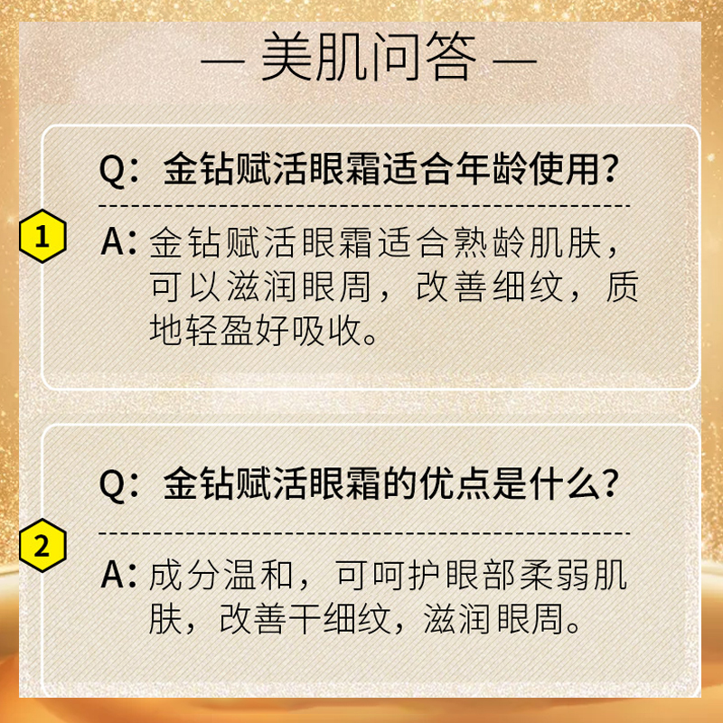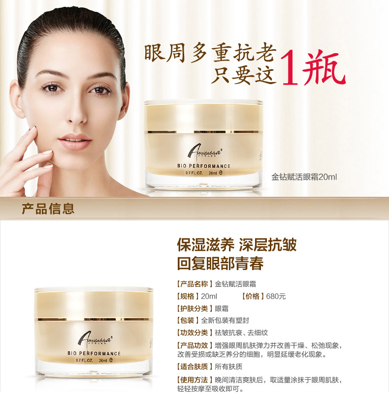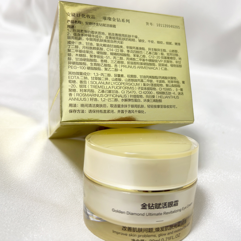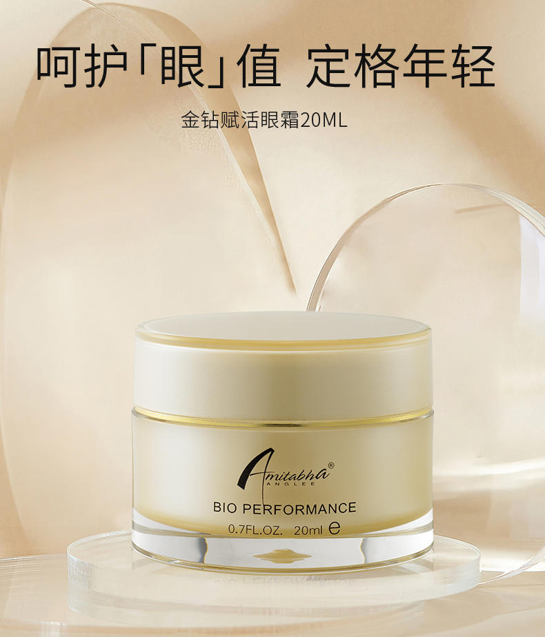 • 商品名称:安婕妤 金钻赋活眼霜20ml 柔细润泽、光滑眼周、淡化细纹、轮廓上扬、改善眼部松弛/眼角皱纹/眼角下垂等问题