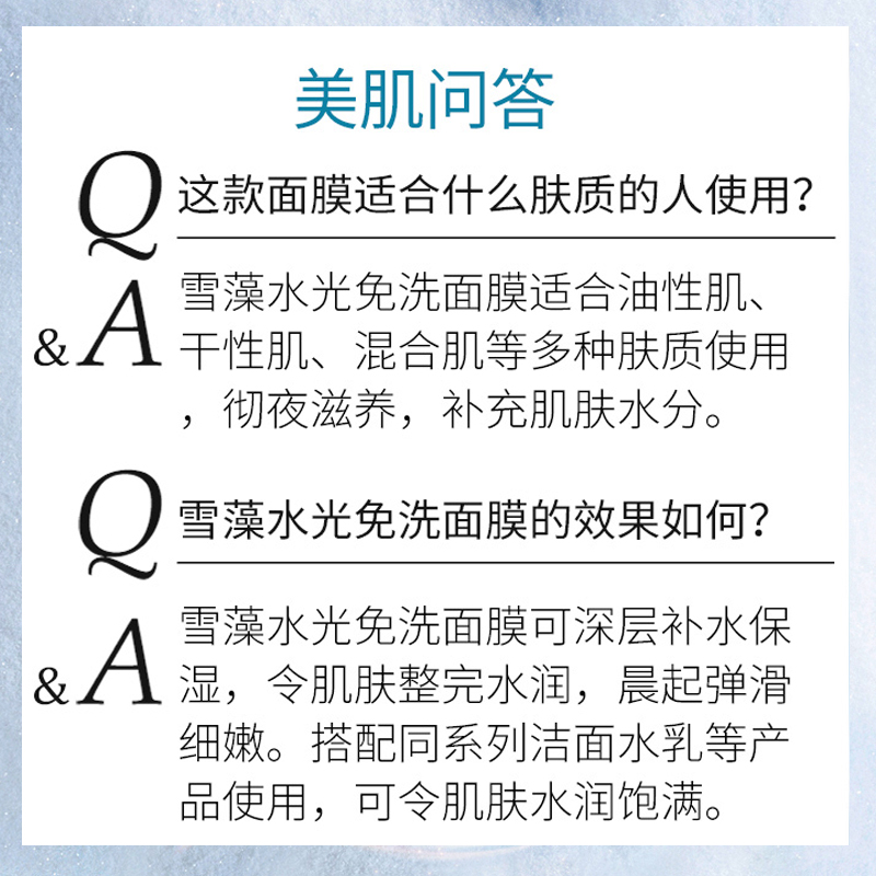 • 商品名称:安婕妤 雪藻水光免洗面膜120ml 免洗质地、清爽易吸收、弹润保湿、修护日间损伤、紧致透亮