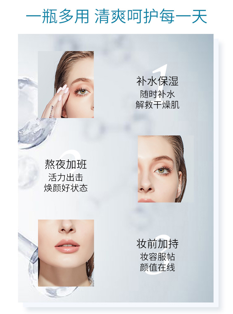 保湿及滋润功能,能在肌肤表面形成高密度的保湿膜,重现水嫩有弹性的健康肤质,肌肤流溢晶莹光彩。、舒缓肌肤不适,补水养颜,净化修护,锁水保湿,还有舒缓的果