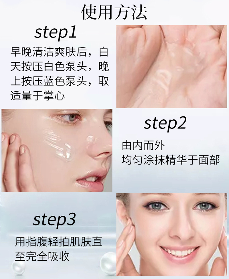 使用方法:洁肤、爽肤后,早上按压白色泵头,晚上按压蓝色泵头,根据个人用量每次按压1至2下于掌心,用指腹由内而外均匀涂抹于面部按摩至吸收。