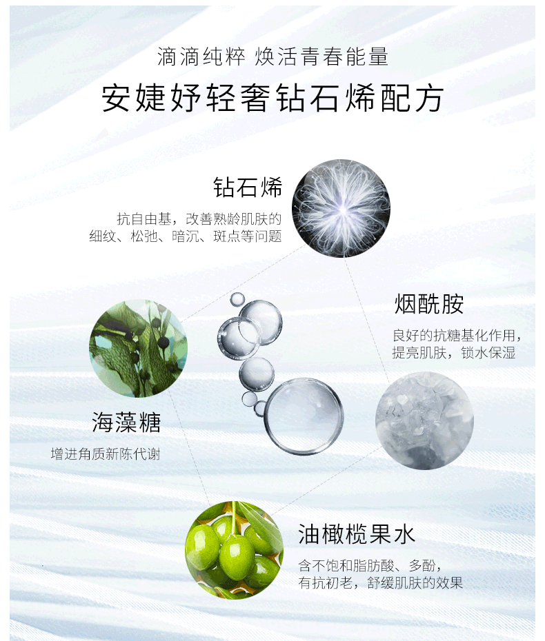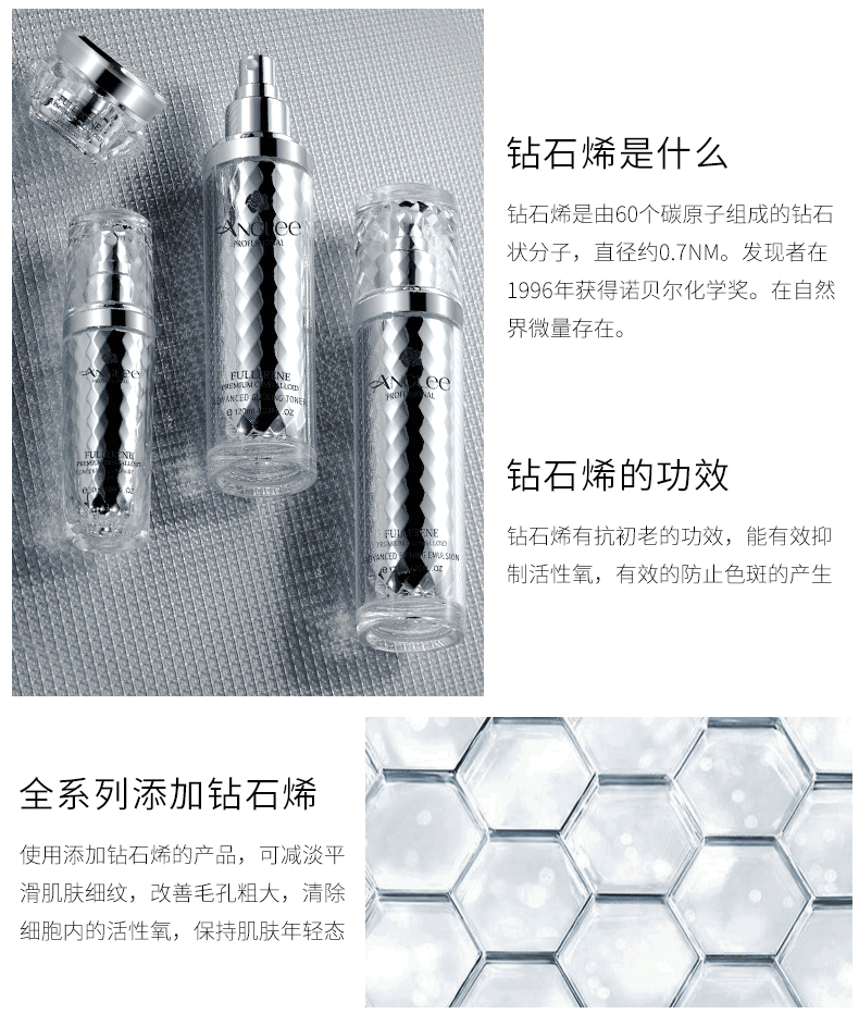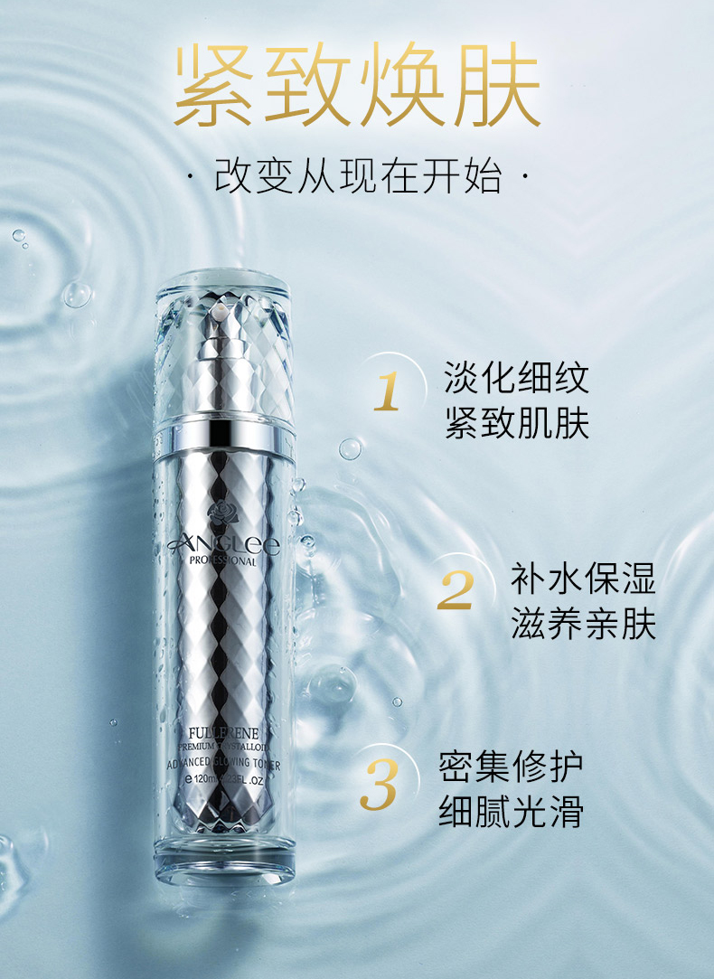 • 商品名称:安婕妤 钻石烯奢养晶致焕肤水120ml 紧致弹嫩、细腻光滑、淡化细纹、补水保湿、改善干燥粗糙肌肤