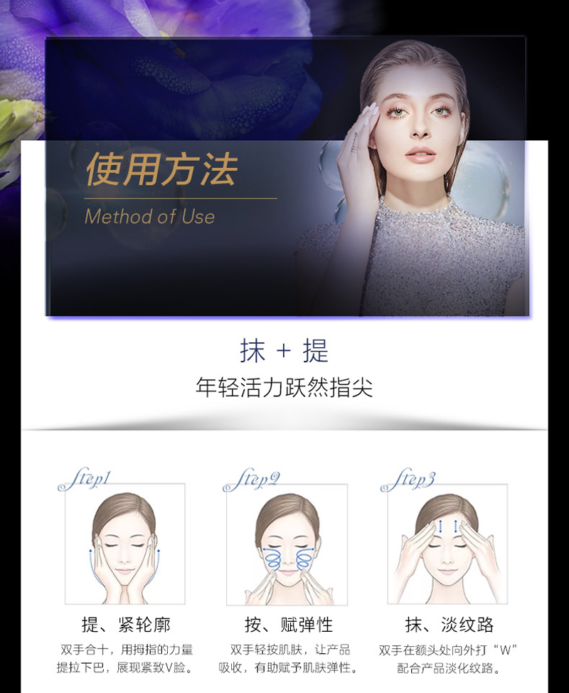 使用方法:早晚洁肤后,取适量轻轻按摩于脸部至吸收即可。