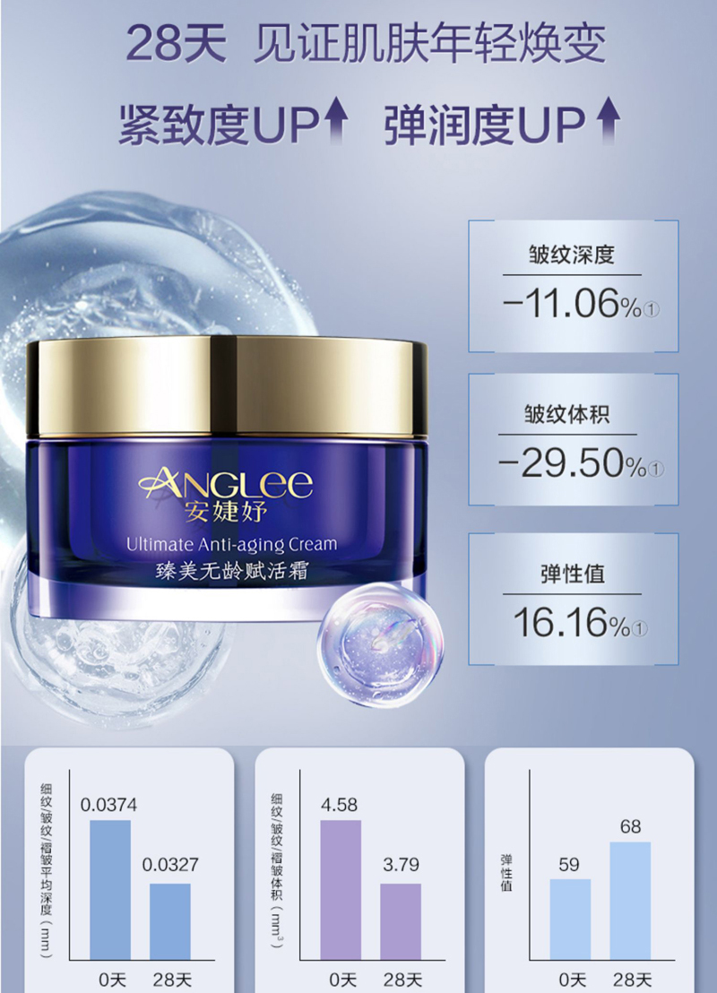 其采用生物大分子的弹性提拉技术,清新并极易吸收的乳霜配方,促进胶原蛋白的合成,深入肌底,由外而内淡化皱纹,使肌肤充满活力,持续使用可紧致容颜。 内撑外拉,紧实塑形,瞬间V脸,显著地增强皮肤弹性与紧实度,有调整下垂松弛肌肤,使脸部线条紧实立体,且自然真实不僵硬。由肌底改善维持年轻肌肤,不仅能改善已有的细小皱纹、改善深层皱纹,更能进一步预防新的细纹产生,赋予肌肤柔软、光滑细致的肤感