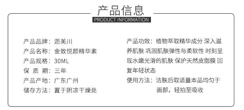 • 商品名称:沥美川 菁致悦颜精华油30ml(金致悦颜精华素)深层滋养、水嫩光滑、紧致弹性、减淡皱纹、提亮肤色、细滑柔嫩