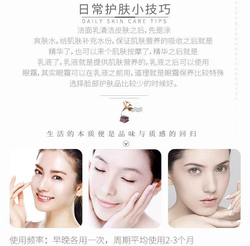 使用方法:洁肤后取适量本品均匀用于面部,轻拍直至肌肤吸收。