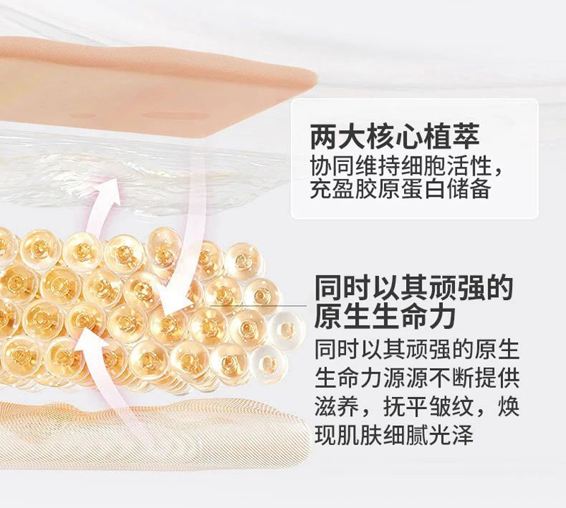两大核心植萃,协同维持肌底活性,充盈胶原蛋白储备。同时以其顽强的原生,生命力源源不断提供,滋养,平抚皱纹,焕现肌肤光泽