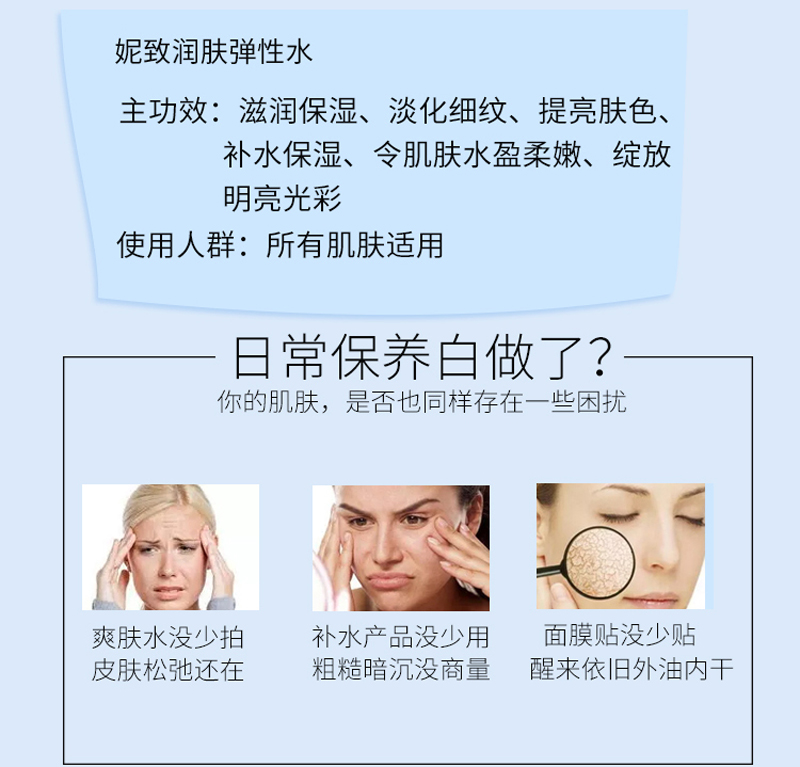 • 商品名称:妮致 润肤弹性水120ml 淡化细纹、改善皱纹和拉伸纹、恢复弹性、嘭弹鲜嫩、舒缓肌肤