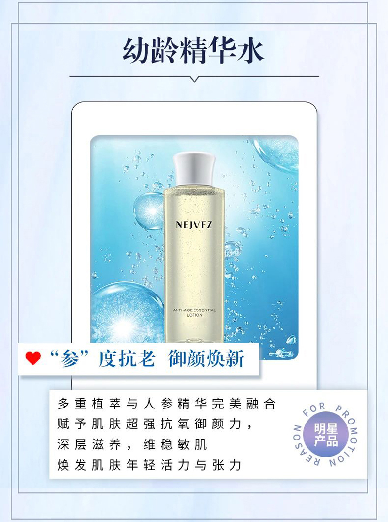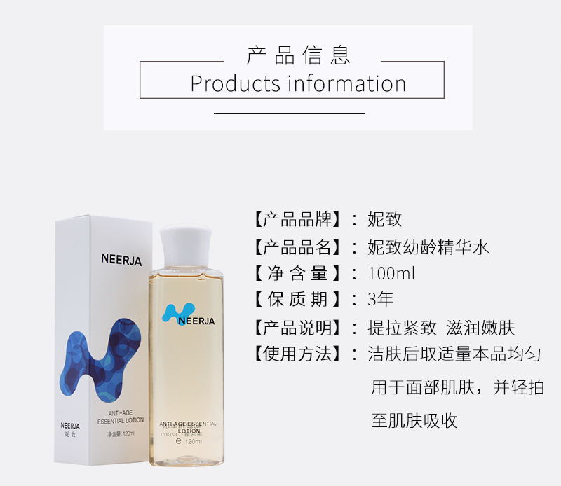 • 商品名称:妮致 幼龄精华水120ml 补充营养、淡化细纹、紧致弹润、饱满水润、细腻嫩滑、改善暗黄、亮泽美肌