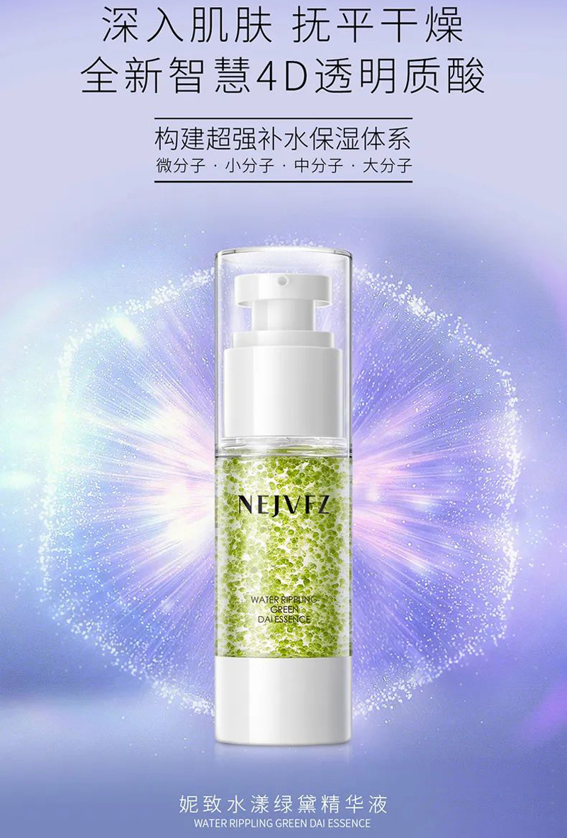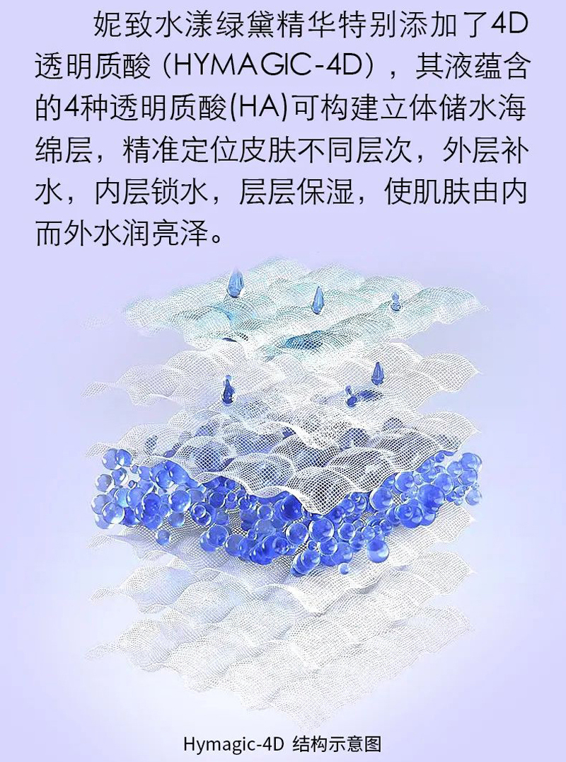 妮致水漾绿黛精华特别添加了4D透明质酸,其液蕴含的4种透明质酸(HA)可构建立体储水海绵层,精准定位皮肤不同层次,外层补水,内层锁水,层层保湿,使肌肤由内而外水润亮泽。