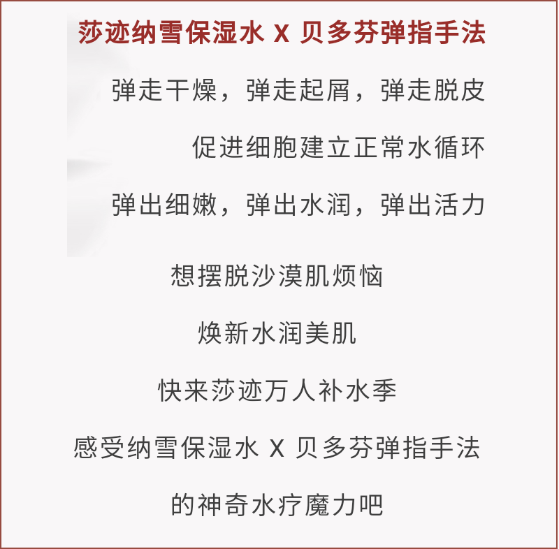• 商品名称:莎迹 纳雪保湿水150ml 密集补水、水嫩细滑、水润饱满、Q弹柔嫩、改善干燥/粗糙/暗沉肌肤
