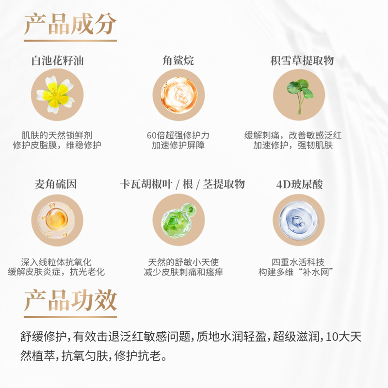 舒缓修护,有效改善泛红敏肌问题,质地水润轻盈,超级滋润,10大天然植萃,抗氧化,匀肤肤色,修护肌肤老化现象。质地轻盈顺滑,多种保湿成分相结合,湿润肌肤,搭配植物舒缓成分,舒缓肌肤,改善肌肤敏/感状态
