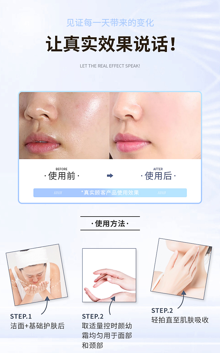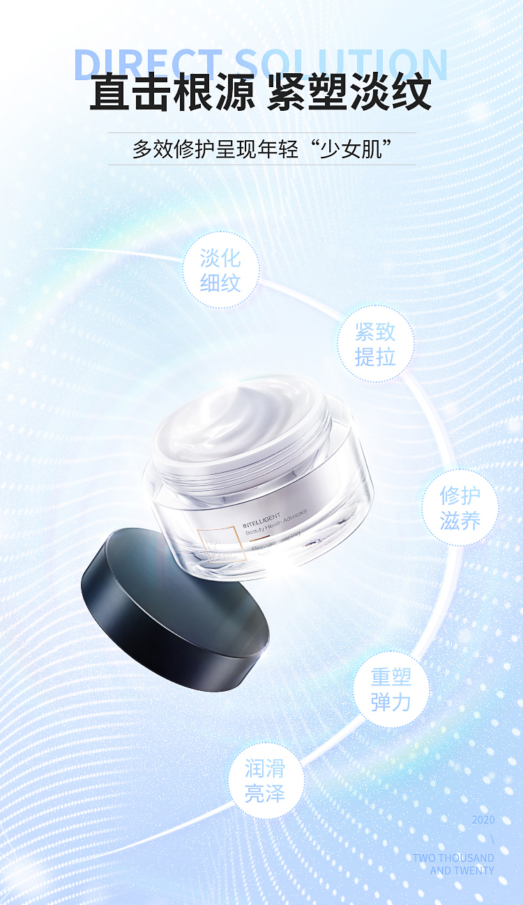 1.唤醒幼颜肌肤淡化皱纹,营养滋润,减少皱纹,恢复皮肤紧实度及弹性(修护受损的红血丝); 2.丰富营养补充,赋予肌肤弹力,令肌肤细腻、紧致、饱满; 3.丝滑乳霜质地,触肤润而不腻轻柔涂抹间,嫩滑肤感、滋润补水,持续使用,令面部肌肤紧致细腻; (适用干燥、老化、松弛、皱纹的肌肤)