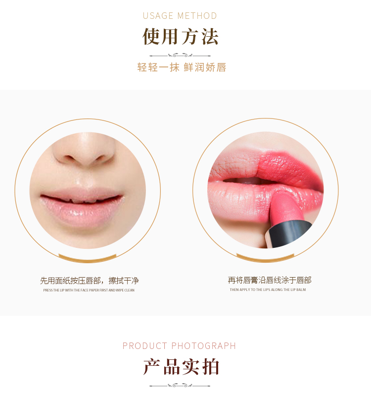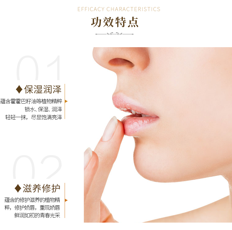 添加霍霍巴籽油保湿护唇精华,滋养、修护、抗氧、保湿四效合一,提亮气色,质地柔软细滑,滋润干燥唇肌,让双唇保持娇嫩丰盈,适合不同季节使用。(先用面纸按压唇部,擦拭干净,再将唇膏轻轻旋转出0.3cm左右,均匀涂抹于唇部即可)