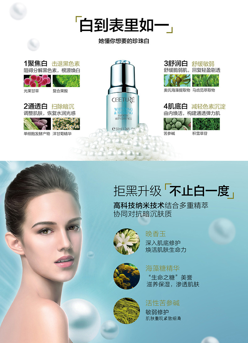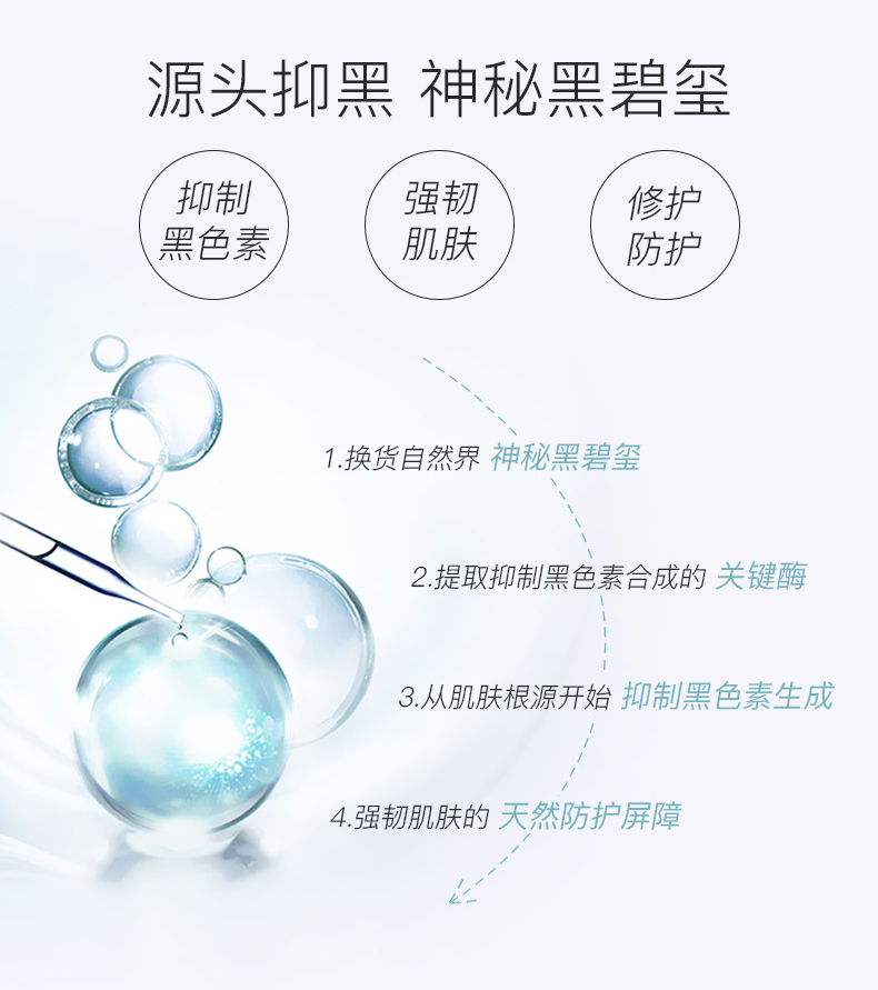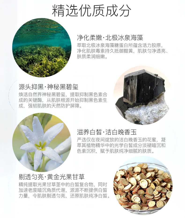 2.珍稀亮白植物浓缩于小小一瓶,其中黑碧玺、晚香玉花更是千元产品御用成分