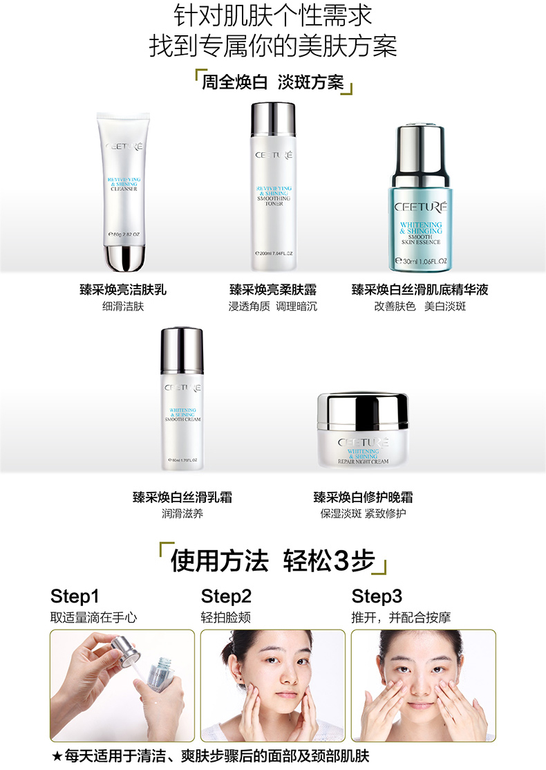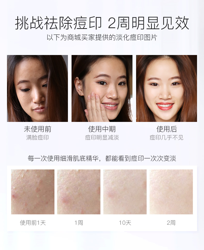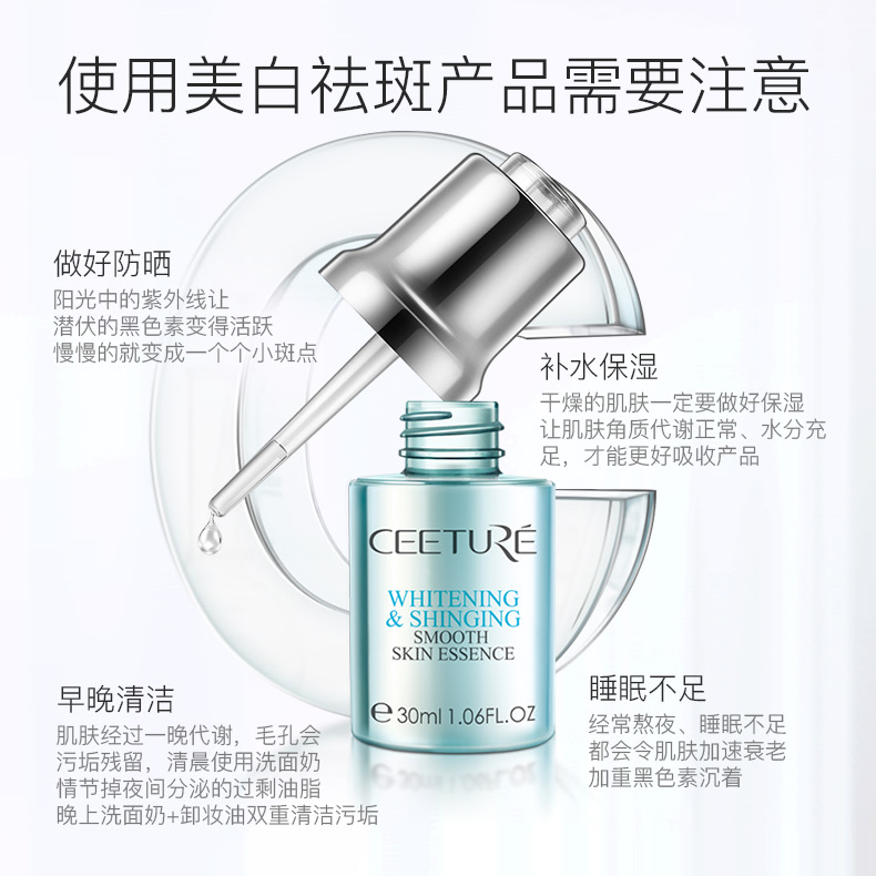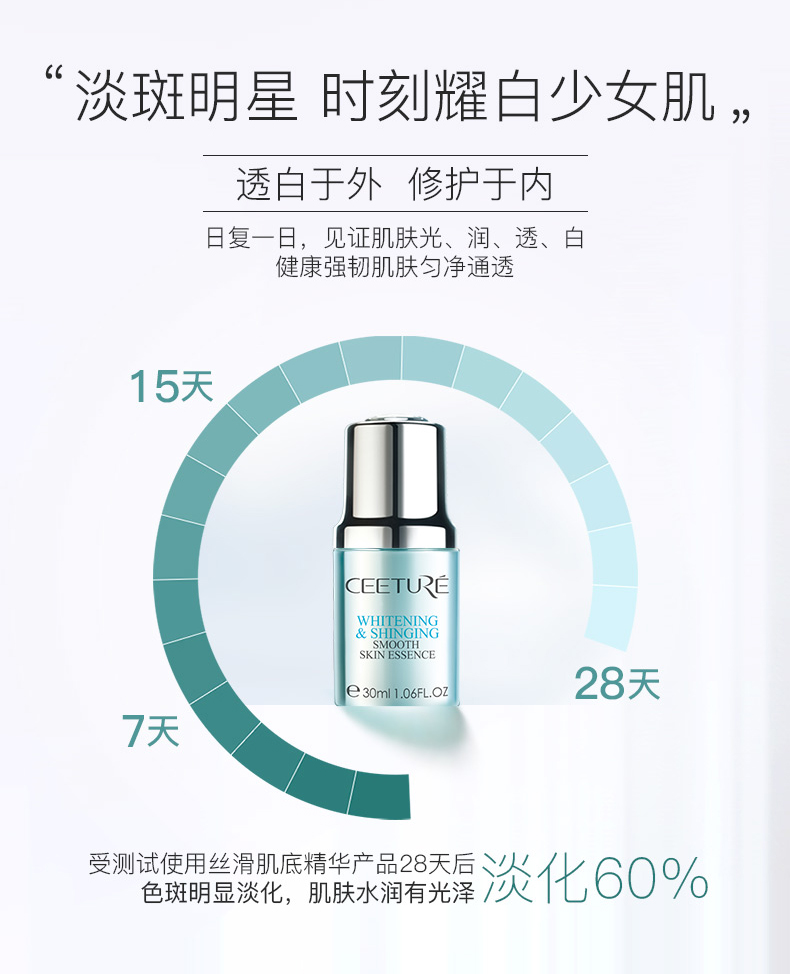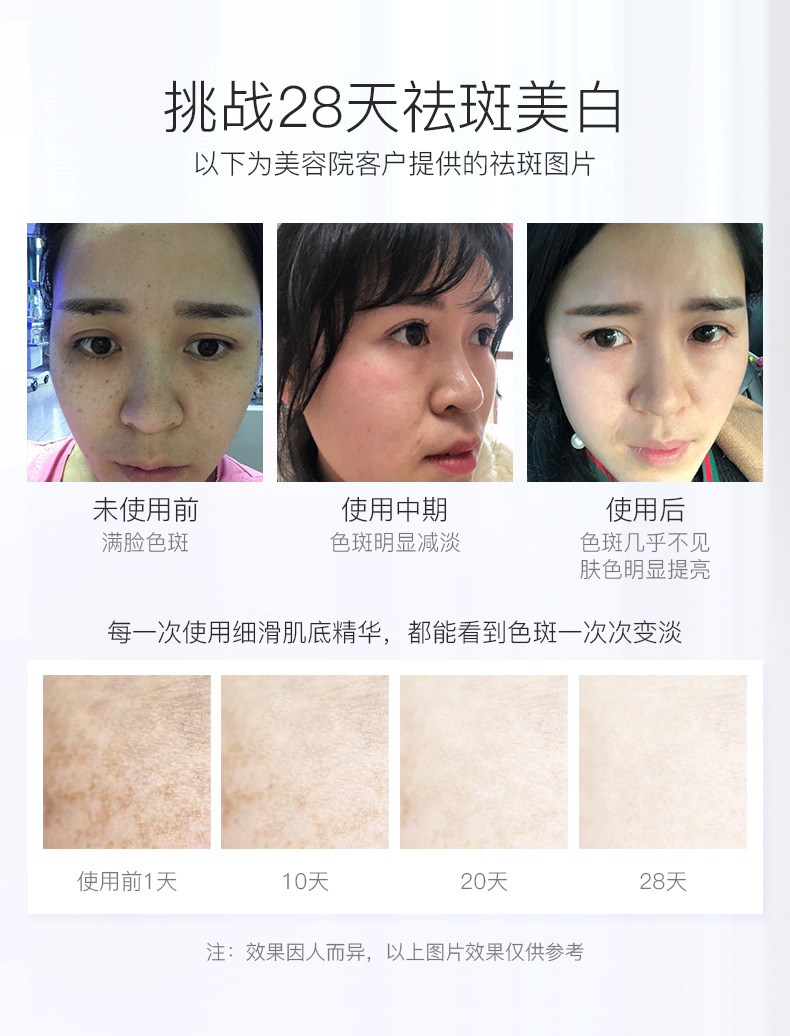 1.提亮肤色,肌肤柔软细滑;2.淡化浅层色斑,甚至消失;3.提升保湿力,促进肌肤增生胶原蛋白,同时胶原蛋白和弹力蛋白的瓦解速度