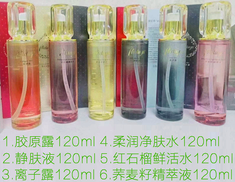 1.红石榴鲜活水120ml2.胶原赋活露120ml3.柔润净肤水120ml4.静肤液120ml5.离子露120ml6.荞麦籽精萃液120ml