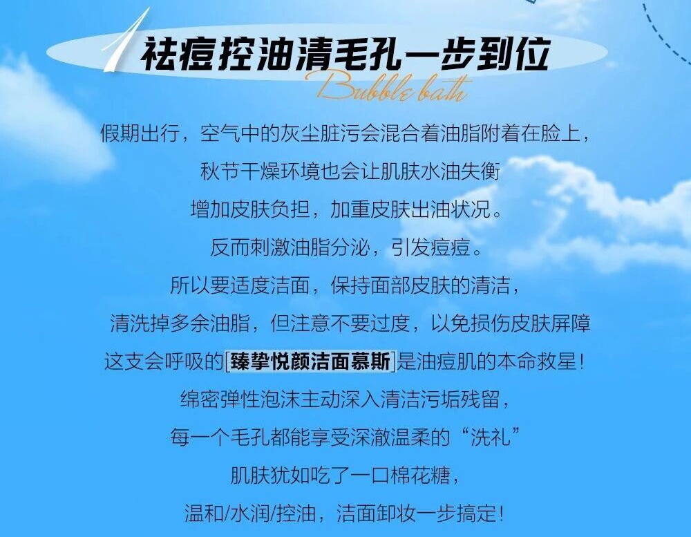滋润肌肤、净透不紧绷,令肌肤水润清透,蕴含海洋保湿因子搭配氨基酸表面活性剂,清洁面部肌肤油脂污垢和卸妆残留物