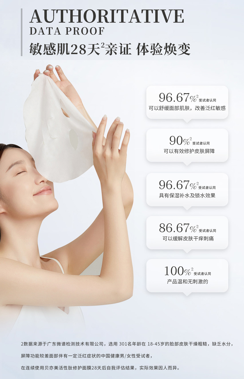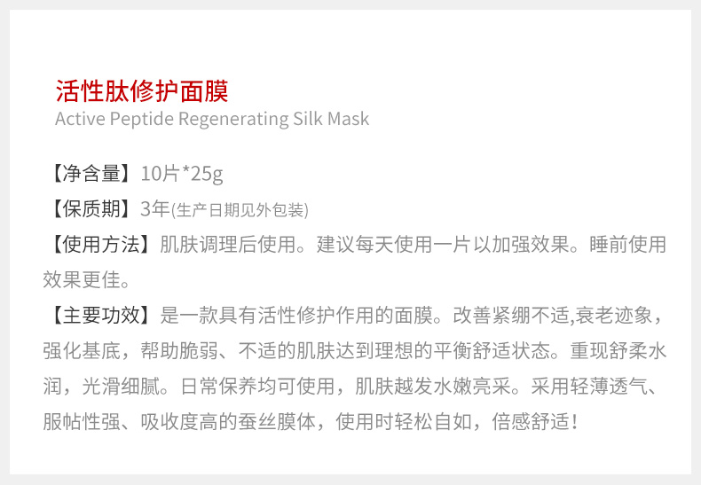 是一款具有活性修护作用的面膜。改善紧绷不适,老化迹象,改善基底,帮助脆弱、不适的肌肤达到理想的平衡舒适状态。重现舒柔水润,光滑细腻。日常保养均可使用,肌肤越发水嫩亮采。采用轻薄透气、服帖性强、吸收度高的蚕丝膜体,使用时轻松自如,倍感舒适