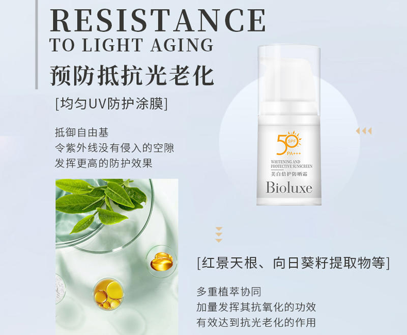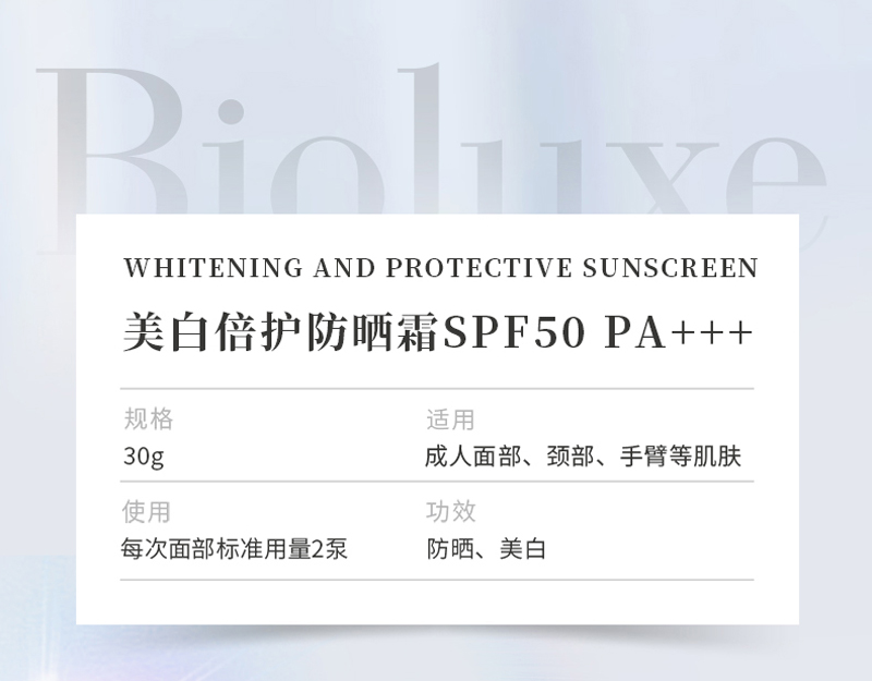 • 商品名称:BIOLUXE美.白倍护防晒霜30gSPF50,PA+++防止晒伤/晒红/晒黑,抵御UV损伤、提亮肤色