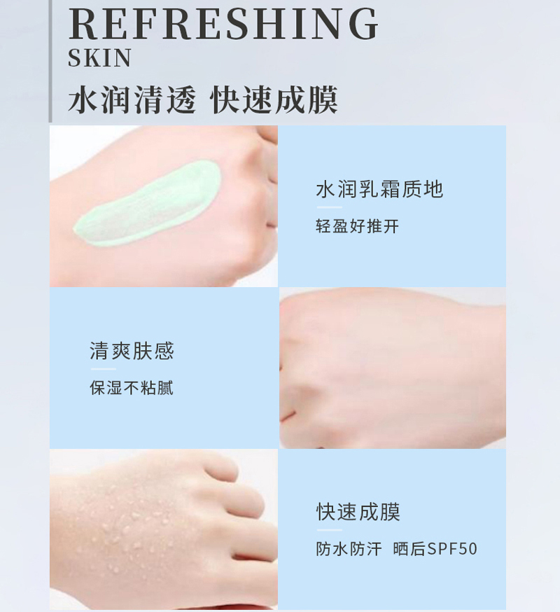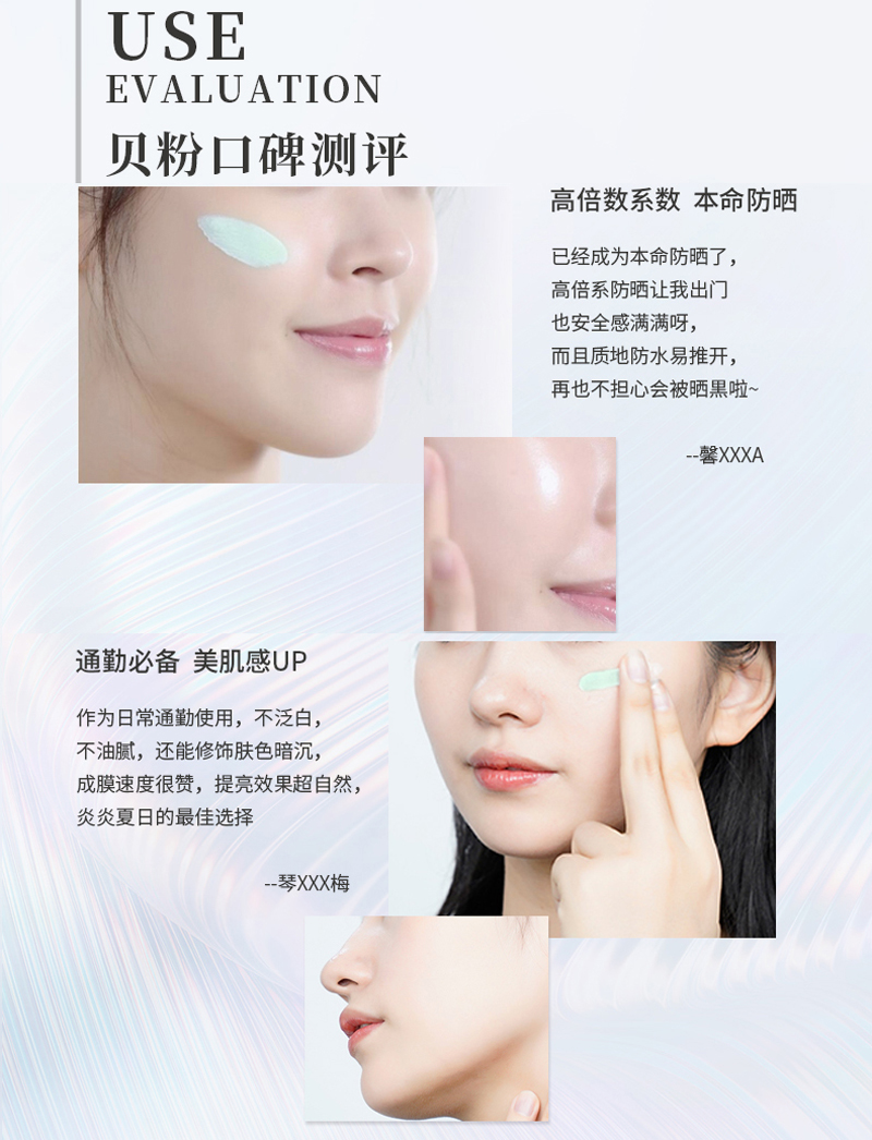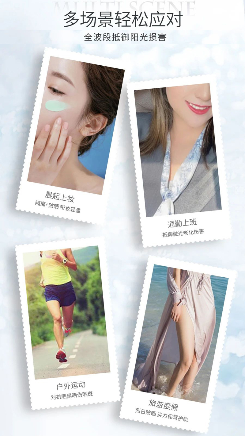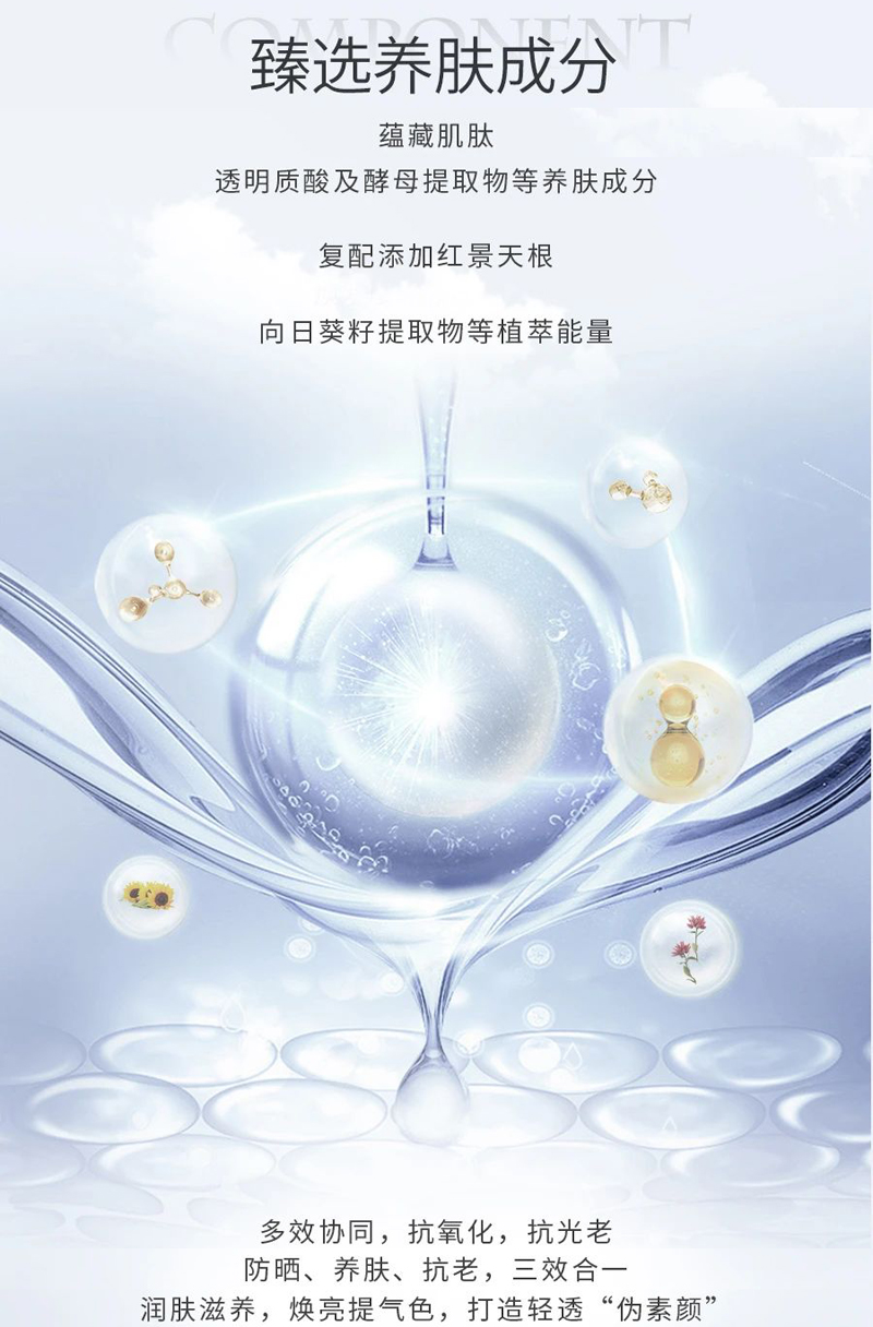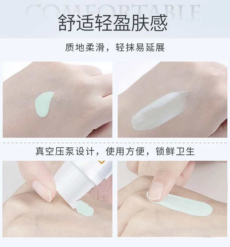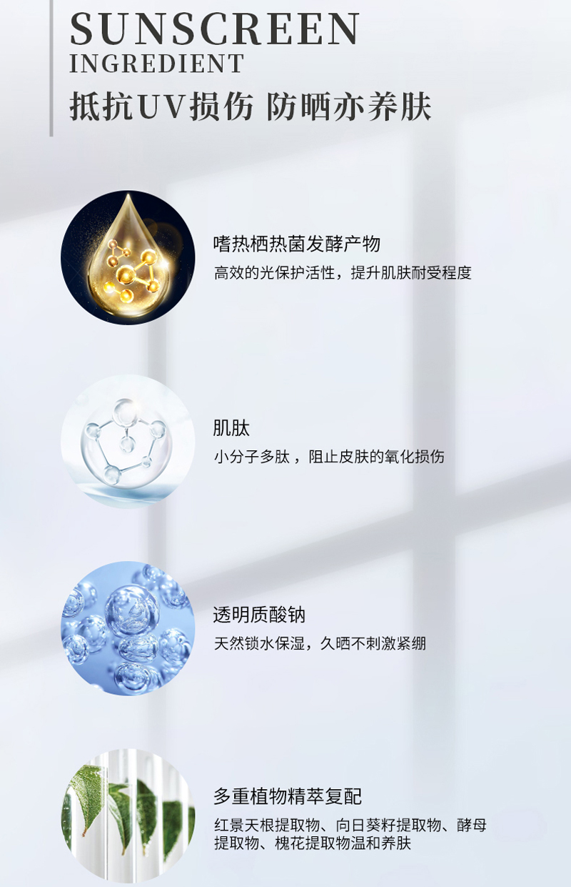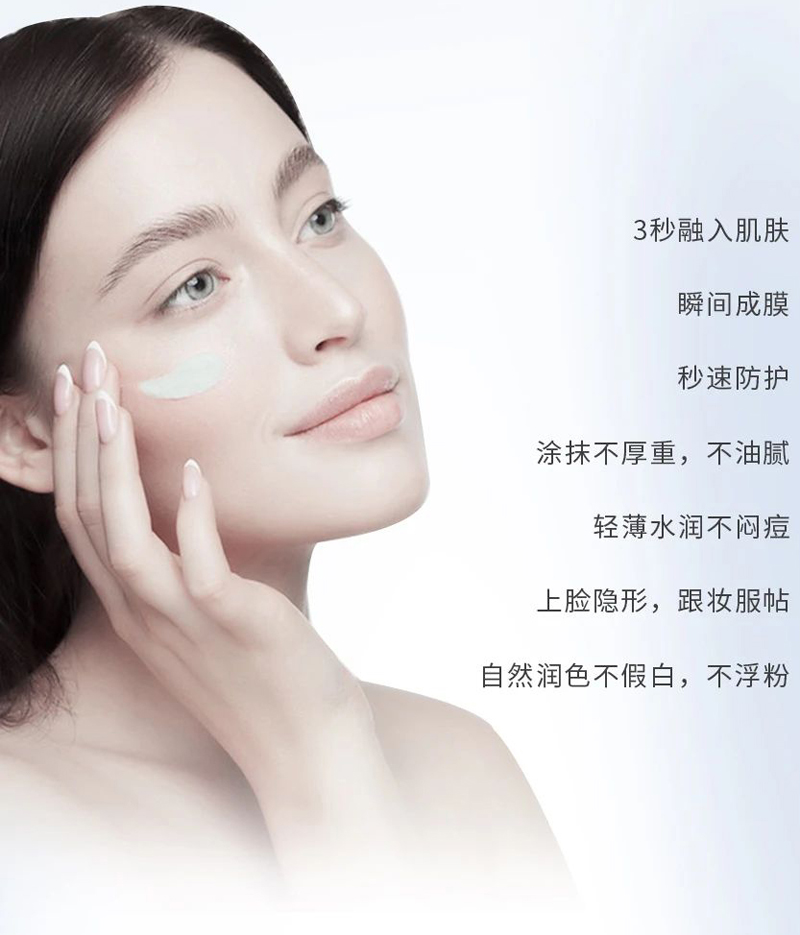 物理和化学防晒双重防晒体系,高倍隔离UVA、UVB,保护肌肤免受特定紫外线所带来的损伤,修饰肌肤色泽不均、暗沉,使肌肤呈现出透亮的自然光泽感