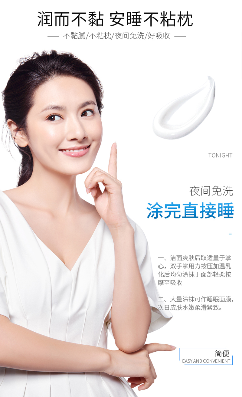 3.大量涂抹可作睡眠面膜使用,次日皮肤水嫩柔滑紧致。