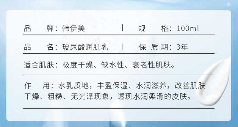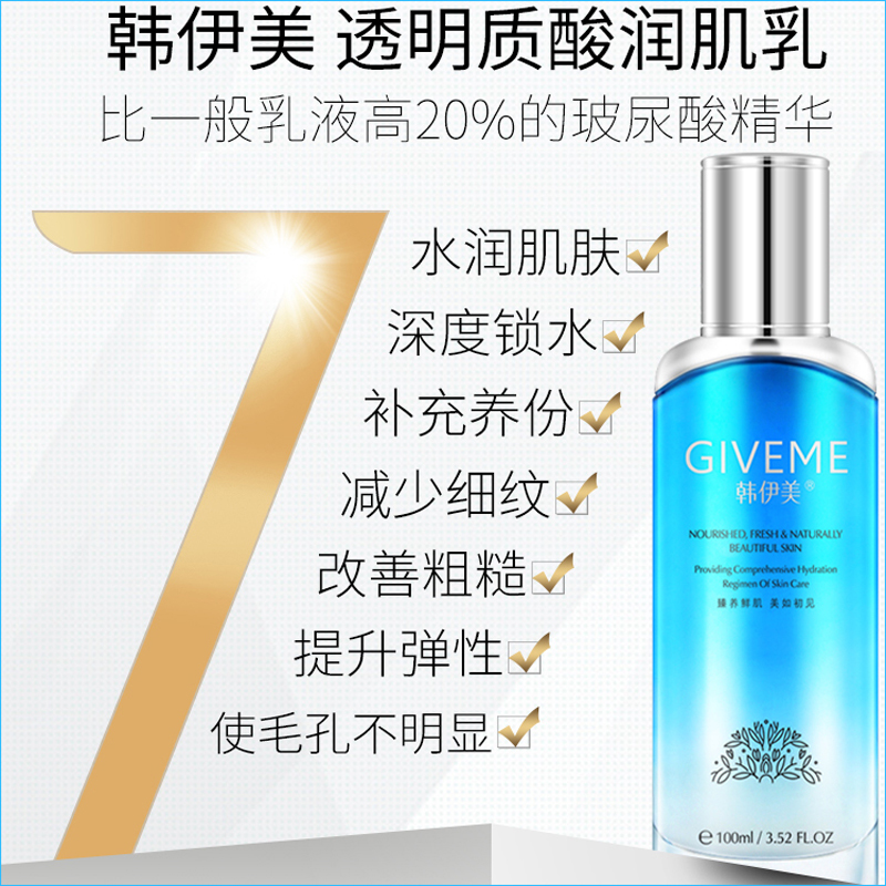• 商品名称:韩伊美 玻尿酸润肌乳100ml(透明质酸乳)水乳质地、丰盈保湿、蜜润养肤、水润柔滑、改善干燥/粗糙/无光泽现象