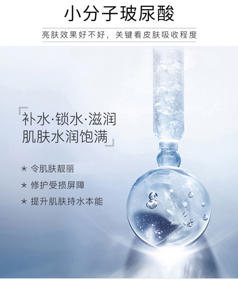 富含浓缩小分子玻尿酸,补充内外基质,促进胶原蛋白合成,淡褪干纹细纹,重现弹润饱满