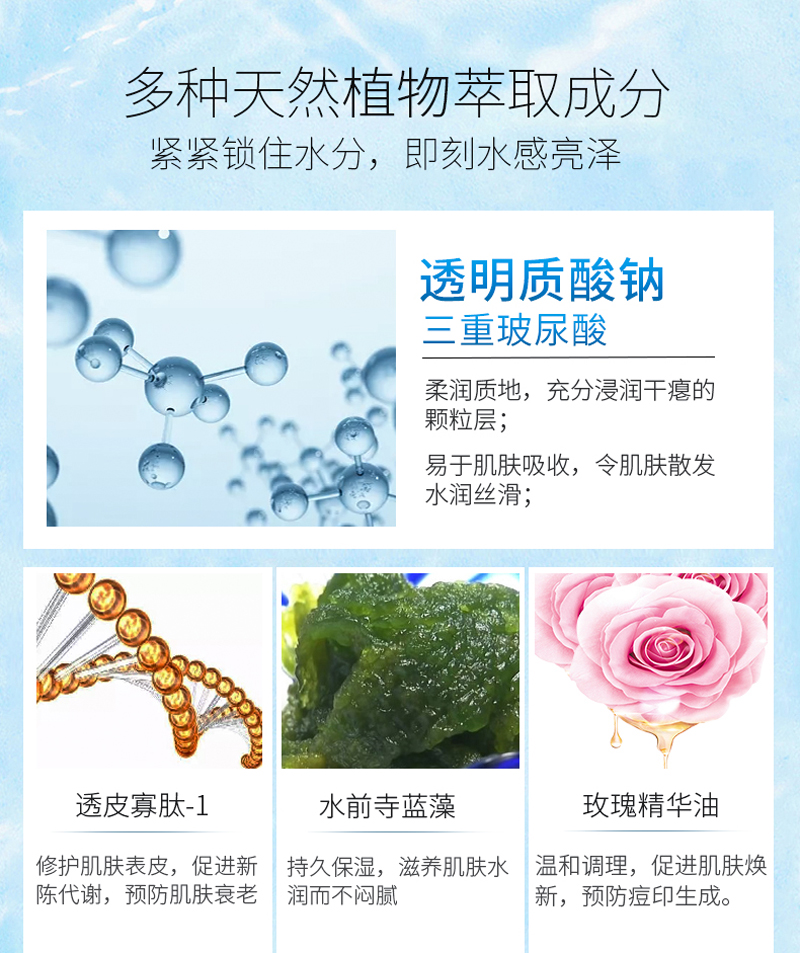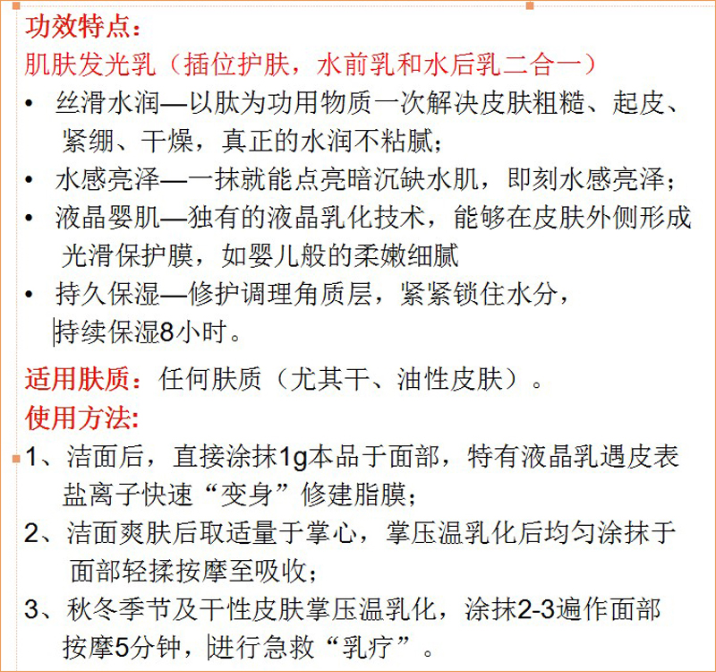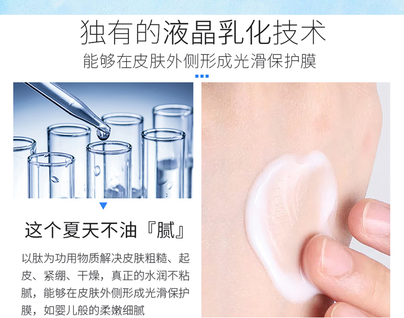 1.丝滑水润——以肽为功用物质一次解决皮肤粗糙、起皮、紧绷、干燥,真正的水润不粘腻;