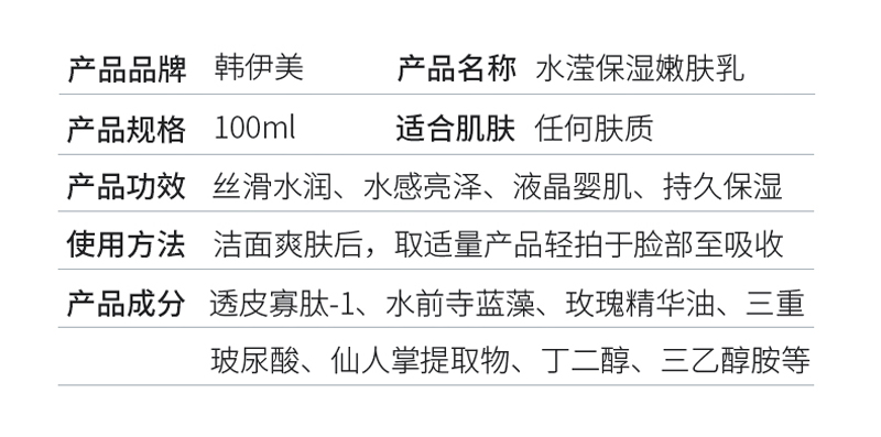 • 商品名称:韩伊美 水滢保湿嫩肤乳100ml 丝滑水润、水感亮泽、持久保湿、嫩滑肌肤