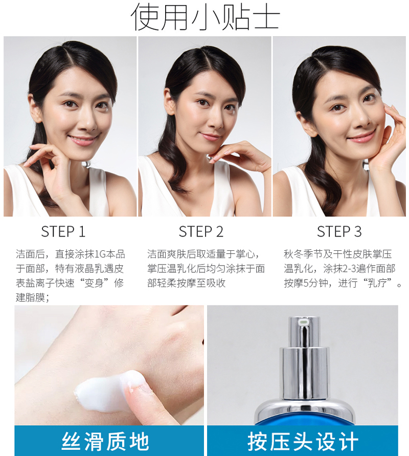1、洁面后,直接涂抹1g本品于面部,特有液晶乳遇皮表盐离子快速“变身”修建脂膜;
