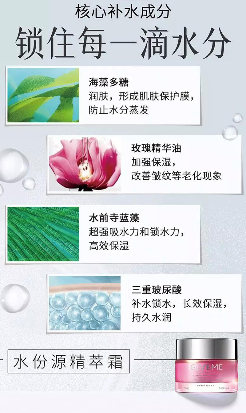 3.皮膜修护——(海藻多糖、三重玻尿酸、玫瑰精华油)科学复配4:6水油比例,瞬间形成仿生皮脂膜,紧密锁水,持久水嫩一整天,还可作晒后修复。