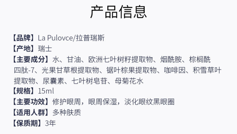 • 商品名称:拉普瑞斯 新生修护眼精华15ml弹润紧塑眼周、淡退纹路、平抚眼袋、减淡浮肿、改善黑眼圈/泡泡眼