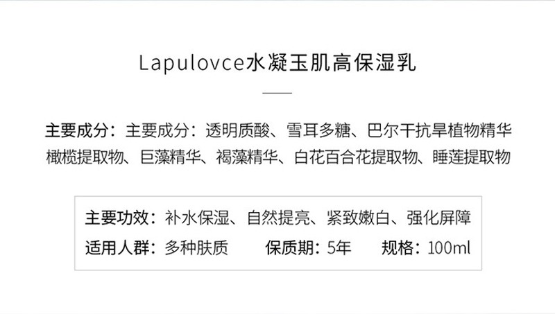 • 商品名称:拉普瑞斯 水凝玉肌高保湿乳100ml 羽感质地、清爽易吸收、深层补水、自然提亮、紧致嫩白、修护屏障